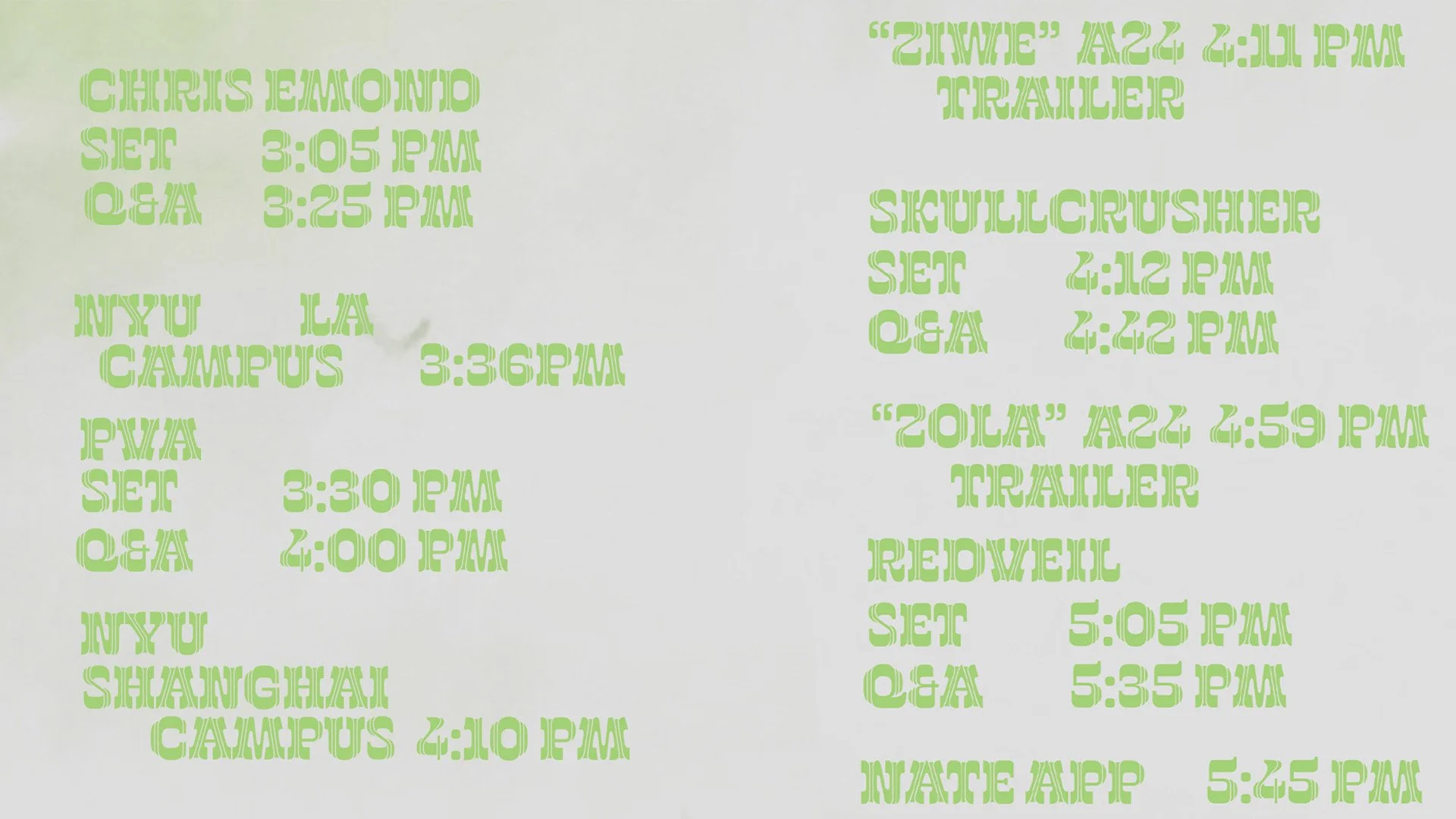 Run of Show detailing musical performances, A24 partnership ads, and promotional videos from NYU leadership.